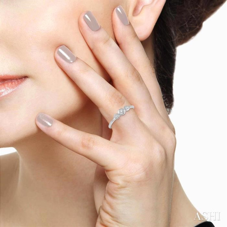 A clear cut layout delicately designed lattice diamond Promise ring, this offers such an appeal that every woman will go gaga over it. Three refined round cut diamonds sit pretty in carved metal rings that are inside individual bezel set. The larger center stone is flanked by a smaller size diamond on either side of it, creating a triple circular motif and adding volume to the ring. Made in a rhodium finish 10 karat white gold, this adorable piece of jewelry is sure to impress your lady love. The total diamond weight is 1/20 Ctw.