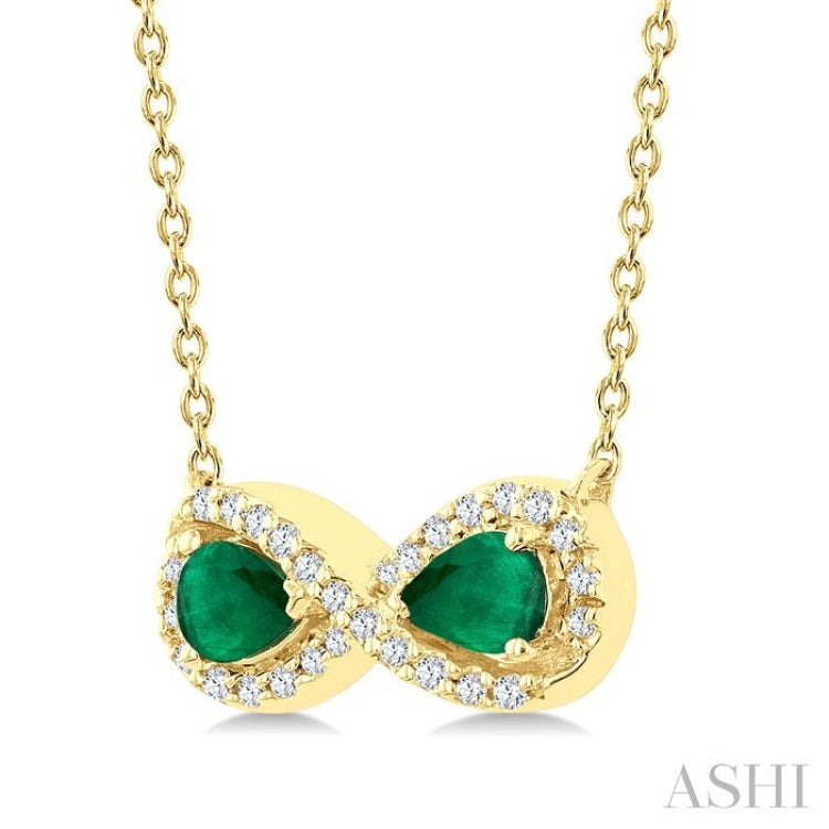 A timeless symbol of endless connection, this infinity precious fashion pendant captures the beauty of forever in a luminous design. Crafted in the graceful contours of a figure 8, representing eternity and unbroken bonds, the pendant curves into two pear-shaped openings, each cradling a vivid 4X3 MM pear cut emerald like a soul held within time. Delicately tracing the flowing curves are 27 prong hand set round cut diamonds, adding radiant brilliance to the symbolic form. An Cable Chain 0.85 MM in 18 Inches with Spring Lock & Extenders at 16" & 17" carries the precious fashion pendant, both molded in 10 karat yellow gold. Total diamond weight is 1/10 Ctw.