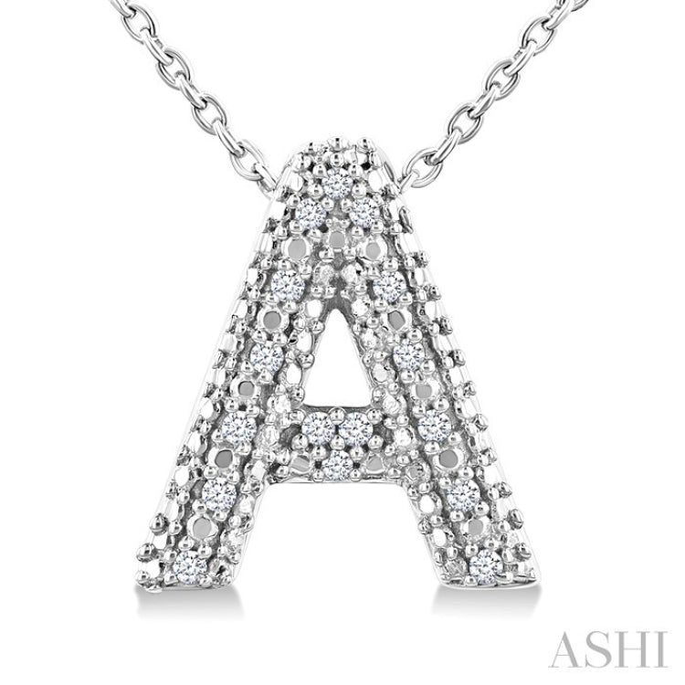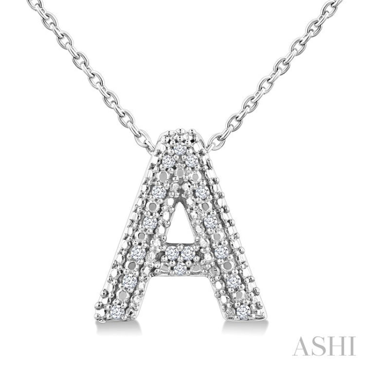 Perfect for gifting or treating yourself, this charming, personalized diamond initial fashion pendant captures the essence of individuality and sophistication. It features a bubble-textured face that adds a touch of whimsy and elegance to the design. The initial 'A' is embellished with 16 prong set round cut diamonds, which sparkle brilliantly against the sleek silver backdrop. Paired with a delicate Cable Chain 1.00 MM in 18 Inches with Spring Lock & Extenders at 16" & 17", both the pendant and chain are styled in a rhodium finish sterling silver. Whether worn alone or layered with other necklaces, this stunning initial fashion pendant is sure to become a cherished piece in your jewelry collection. The total diamond weight is 1/20 Ctw.