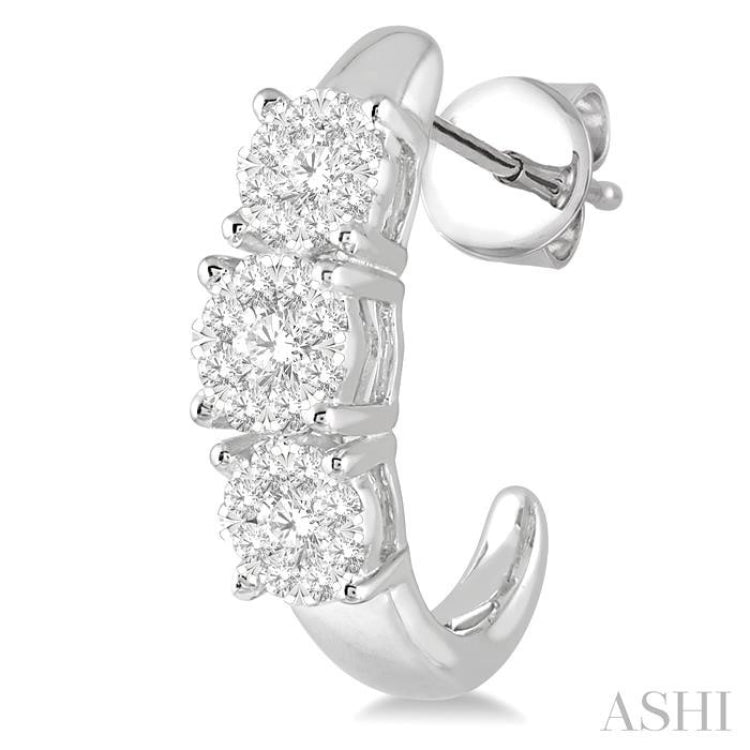 An alluring pair of Lovebright diamond earrings; these offer elegance to any ensemble. Each earring features 3 circular mounts, one large in the center flanked by a smaller mount on either side of it. A invisible set round cut diamond embellishes the center of each of the 6 mounts. This is bounded by 8 small invisible set round cut diamonds, a total of 48 diamonds on all the mounts. A push back clasp secures the earrings in place. The earrings are framed in 14 karat white gold. Total diamond weight is 3/4 Ctw.