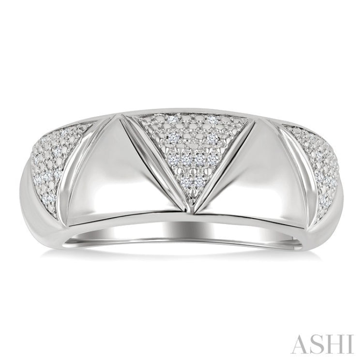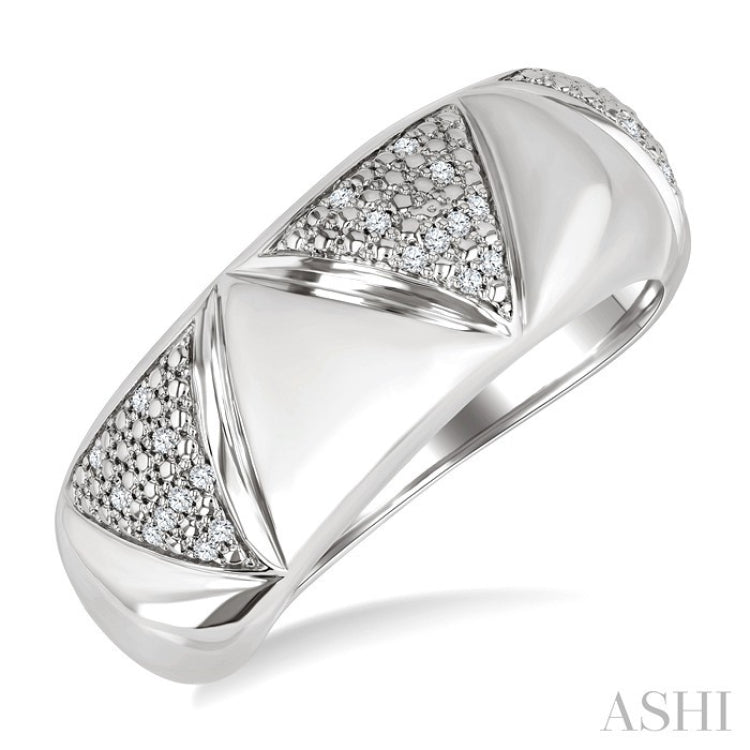 An attractive bold diamond wide fashion band, this makes for a refined addition to one's collection. It showcases a striking zig-zag pattern of alternating straight and inverted triangles. Plain silver triangles are set alongside diamond-encrusted triangles, creating a bold Chevron zig-zag design. A total of 30 prong set round cut diamonds adorn the three diamond-embellished triangles, 10 on each triangle, adding brilliance to the modern geometric look. Crafted in rhodium finish sterling silver, this wide diamond fashion band is perfect for making a statement. The total diamond weight is 1/10 Ctw.