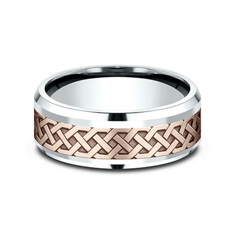 8mm, Comfort fit14K White and Rose GoldCeltic knot patterned center, bevel edges
