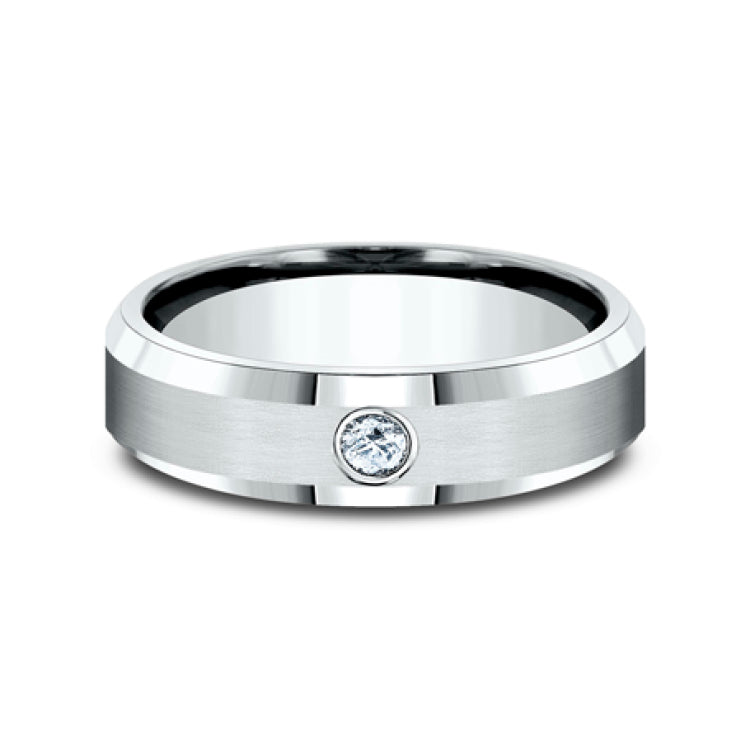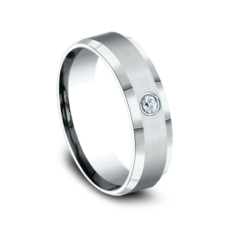6mm, Comfort fit14K White GoldSatin finish, polished bevel edges1 burnish set diamondCarat weight is .08ctClarity SI1-2, Color GH