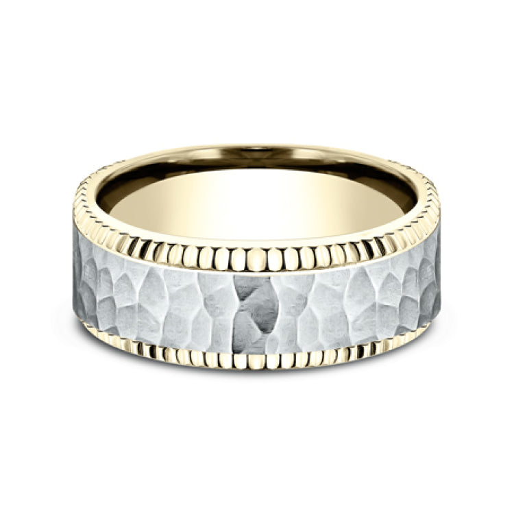 8mm, Comfort fit14K Yellow and White GoldHammered center, fluted bevel edges