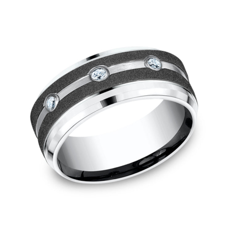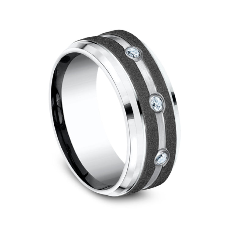 9mm, Comfort fitWhite CobaltGraphite stripes, center diamonds with bevel edges3 burnish set diamondsCarat weight is .20ctClarity SI1-2, Color GH