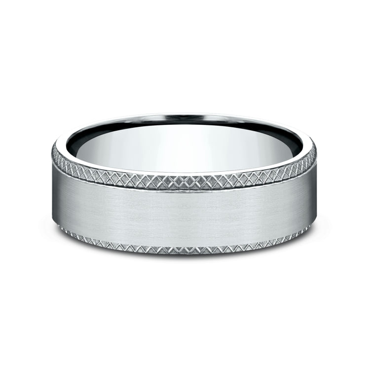 6.5mm, Comfort fit14K White GoldSatin finish center, knurl detailed edges