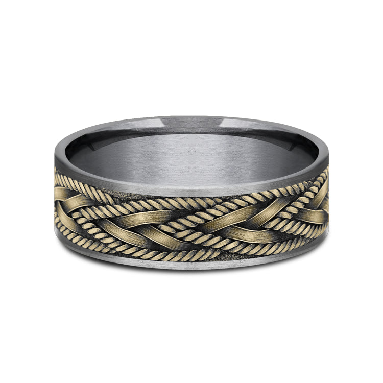 7.5mm, Comfort fit Grey Tantalum and 14K Yellow Gold Rope and wheat knot braid pattern, thin edges