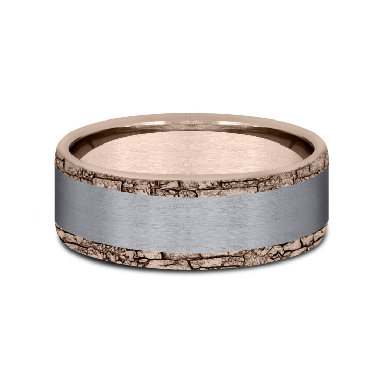 8mm, Comfort fit 14K Rose Gold and Grey Tantalum Satin center, stone wall patterned edges