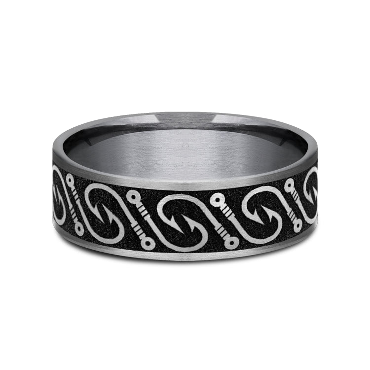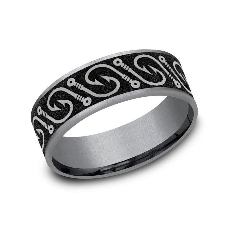 7.5mm, Comfort fit Grey Tantalum and Grey/Black Titanium Fish hook patterned center, thin edges
