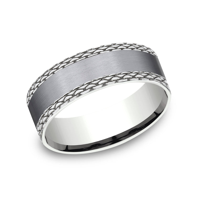 7mm, Comfort fit Grey Tantalum and 14K White Gold Satin center, chain link patterned edges